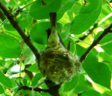 Below is a typical view of a Cassin’s Vireo in the canopy (backlit and facing away). She was weaving material into the nest, then sat down to assure a good fit.