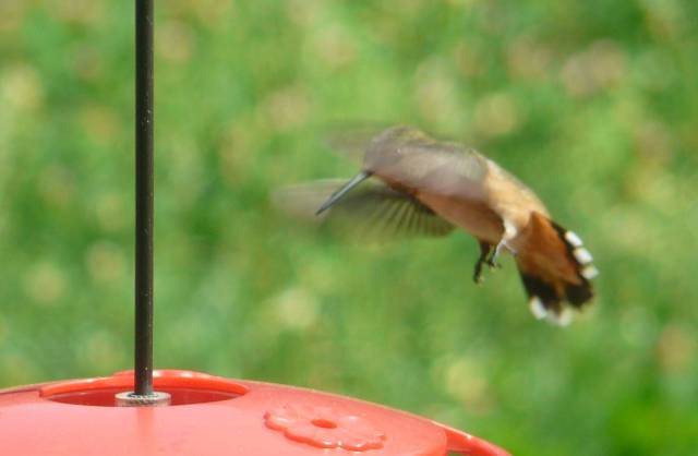 Rufous Hummingbirds are passing through. While they are noticeably smaller than the Anna’s, they are much more aggressive in claiming the garden as their own. I have read about two solutions for warring hummers; one is to put another feeder out of sight of the first, the idea being that while the dominant hummer is guarding one feeder, other birds can feed on the other. The other plan is to put several feeders in close proximity, in hopes that the dominant bird can’t guard them all at once and will share. I haven’t tried either of these, primarily because I don’t want to maintain two feeders.