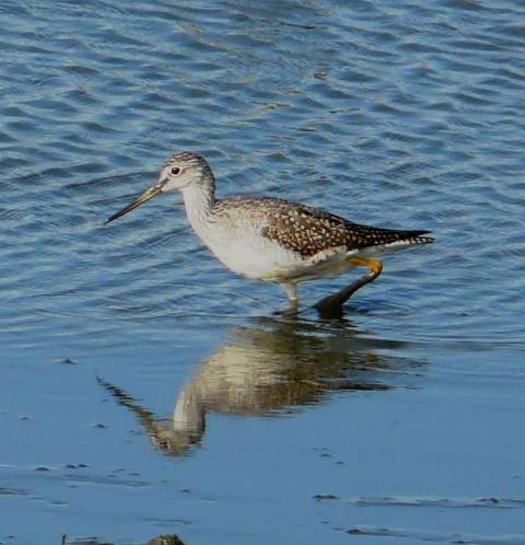 Greater Yellowlegs on the left, Lesser Yellowlegs on the right