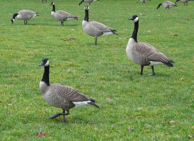 Here is the Lesser Canada in front of the larger Western Canada Goose (Branta canadensis moffitti). Note the smaller overall size of the Lesser, and the proportionally shorter neck.
