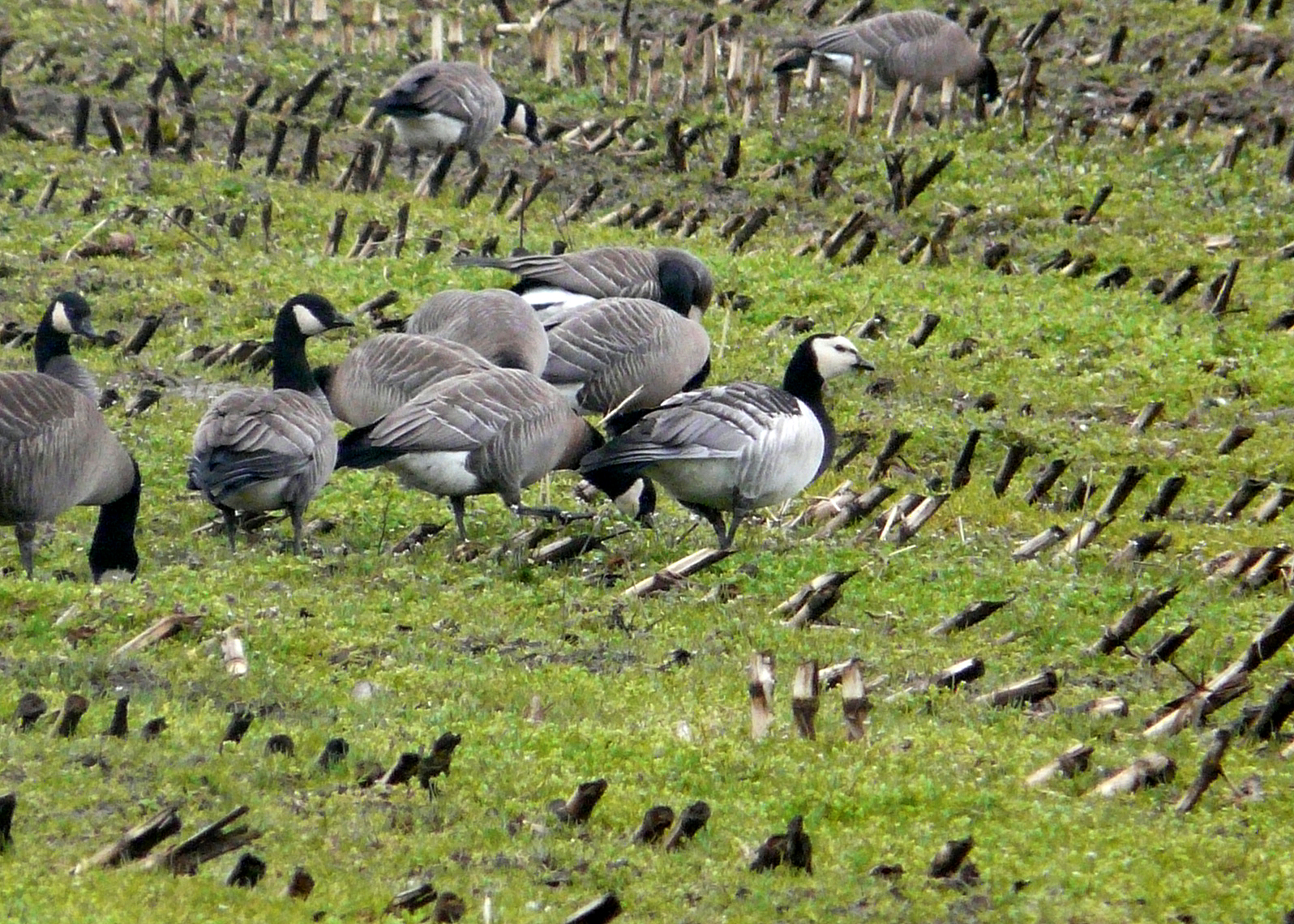 Given that this bird is associating with a flock of Ridgeway’s Cackling Geese (another long-distance migrant from the Arctic), and shows no sign of former captivity, I am inclined to consider him a naturally occurring vagrant. Of course, the goose doesn’t care what we call him. Whatever his origins, I am grateful for the opportunity to see a free-flying Barnacle Goose  without my having to visit Greenland or Scotland to do so.