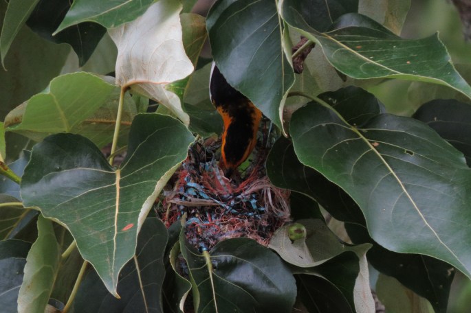 I spent a little time watching an active Bullock’s Oriole nest at Fernhill Wetlands. Notice how the birds have incorporated strands from a blue plastic tarp into the nest. Using plastic debris in nest construction is not unusual. In Kansas I saw a Baltimore Oriole nest made entirely from fishing line. The plastic makes a sturdy nest, but the material can be deadly if a bird gets a foot entangled in it. These orioles, including the baby shown here, seem to be doing alright.