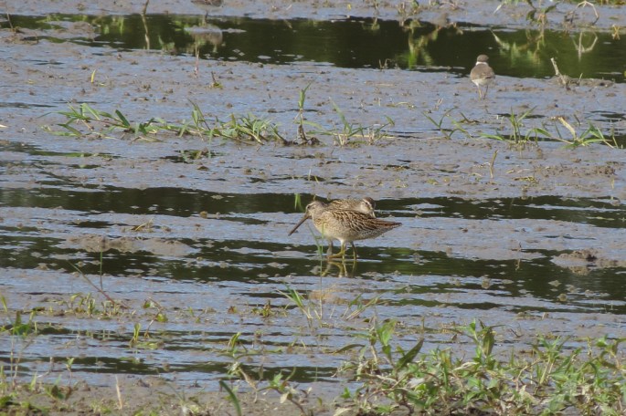 There were a few Short-billed Dowitchers mixed in, although the distance made identification challenging. Note the whitish belly, the spotted sides of the breast, and the tiger-striped tertials.