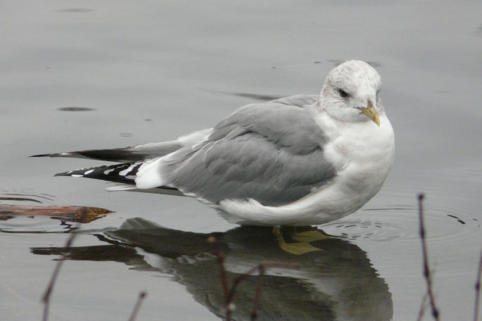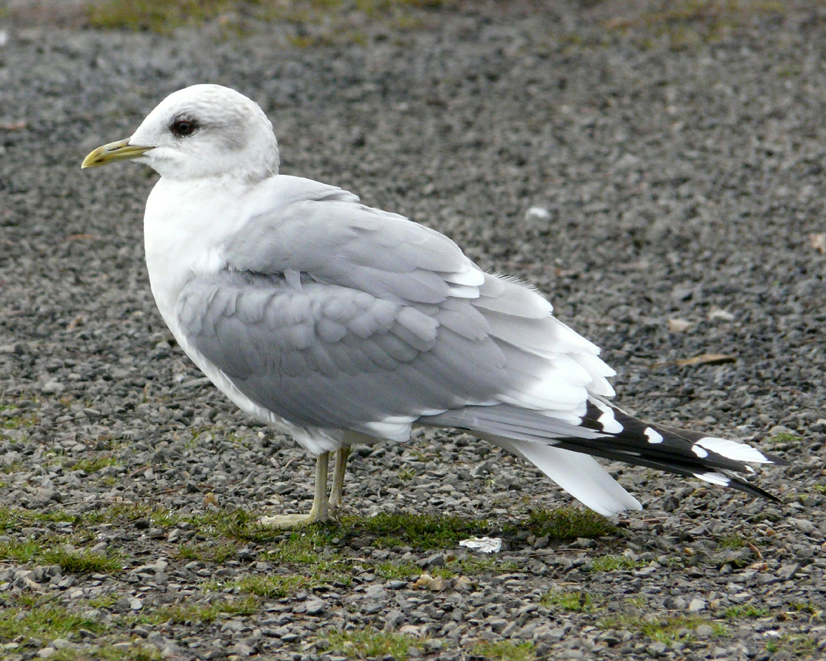 As gulls go, Mew Gulls are very petite. They are instantly recognized by their round head, dark eye with a brick-red orbital ring, long wings, yellow legs, and thin bill with just a hint of a “ring” in winter.