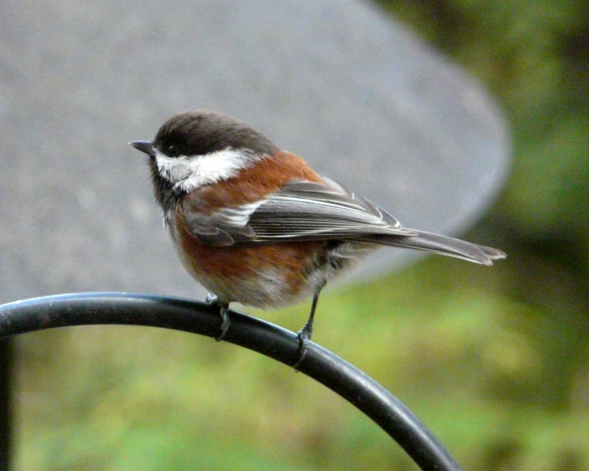 A pair of Chestnut-backed Chickadees has been lingering in the yard this week. They will soon leave for the summer, as this species prefers large conifers and higher elevation, unlike the more suburban Black-capped Chickadees.