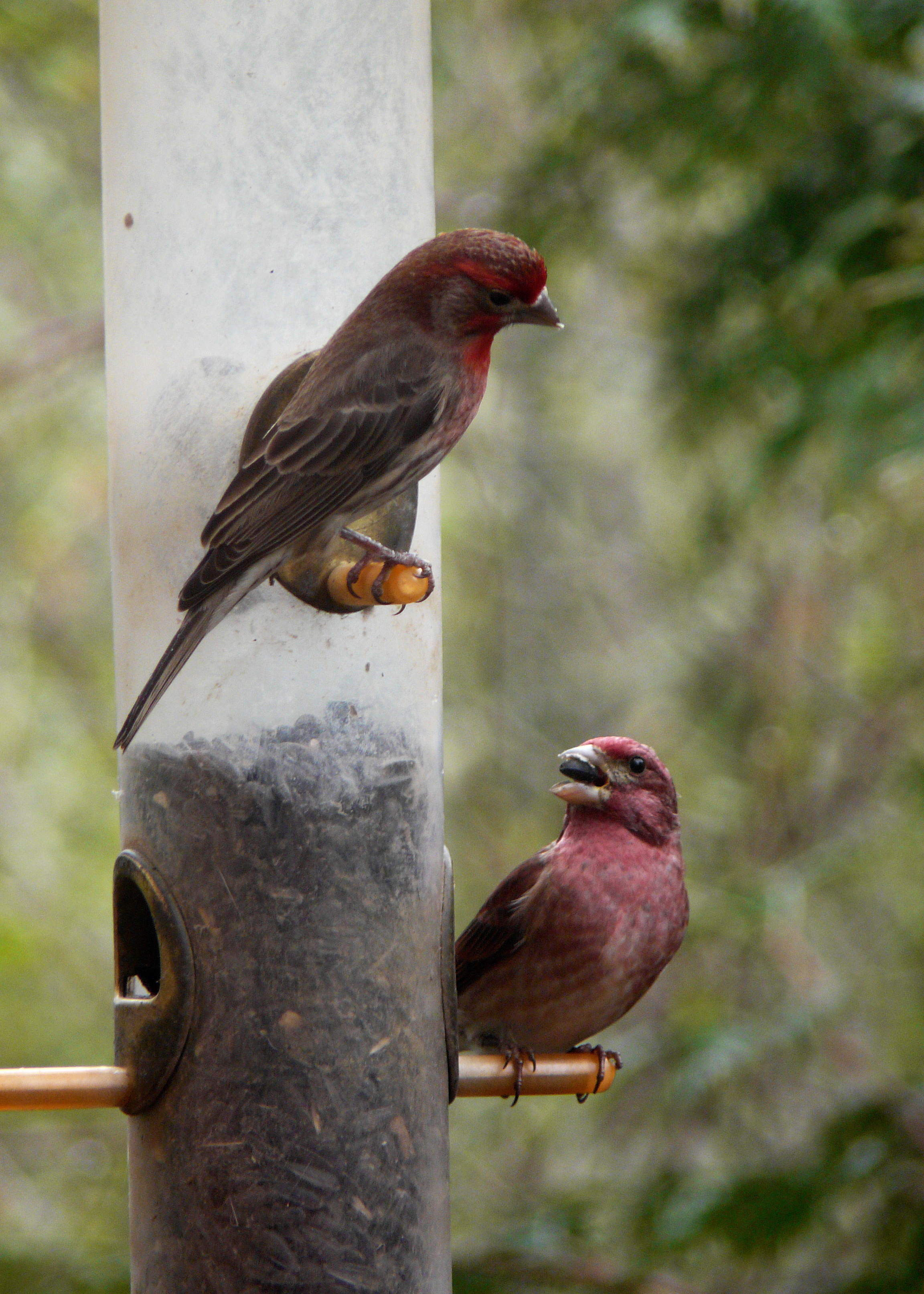 Many years ago, before House Finches had spread across the entire continent, separating House and Purple Finches was considered quite a challenge. But here, with the benefit of a few decades experience, they don’t look all that similar. There are clear differences in color, and the Purple Finch shows quite a bit more heft than the more slender House Finch. While the House Finch has patches of red, the Purple Finch is pinkish-purple all over.