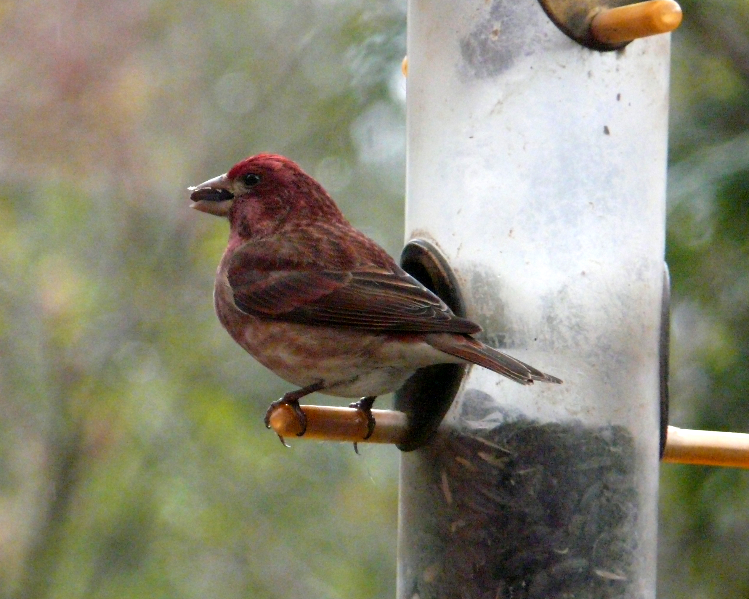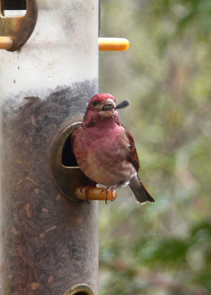 This La Nina weather pattern shows no sign of abating, making outings miserably wet and not so productive, so I was delighted to see a Purple Finch in the yard this week. About once a year I see a Purple Finch at my feeder. They breed in mixed woodlands in the Portland area, but not in my neighborhood.