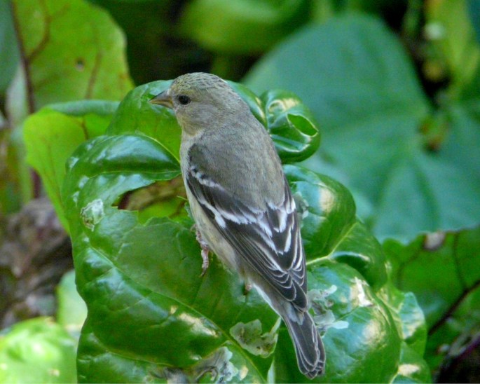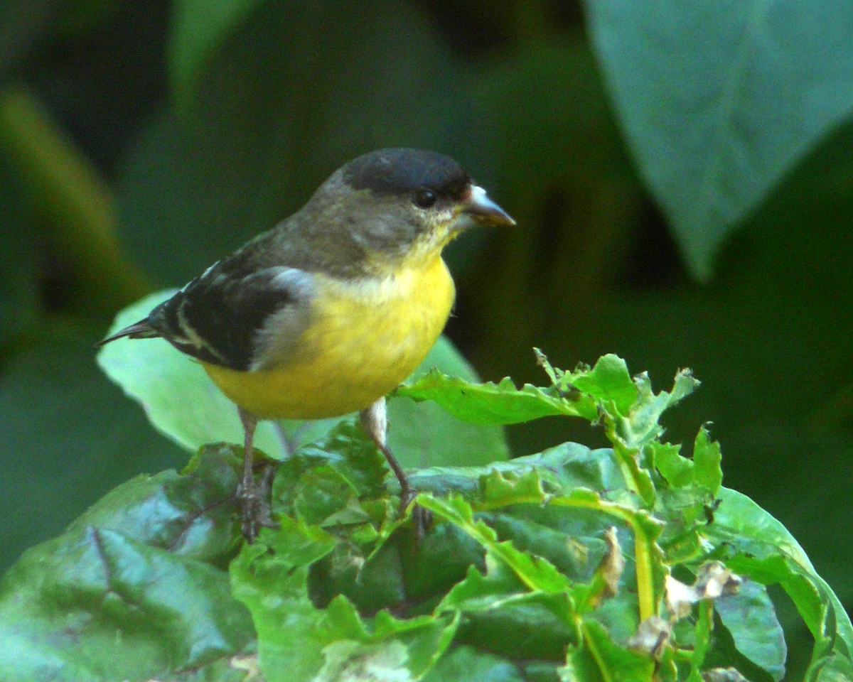 A pair of Lesser Goldfinches (female above) has been visiting the garden lately to feed on rainbow chard. Goldfinches eat a lot of foliage, in addition to seeds and buds. This vegetarian diet makes goldfinches poor hosts to cowbirds, whose young require plenty of insect protein to grow and thrive.