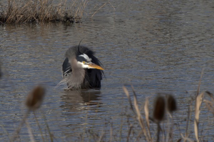 This Great Blue Heron was wading deep at Commonwealth Lake. The white face and yellow eye really popped, giving her a creepy look.