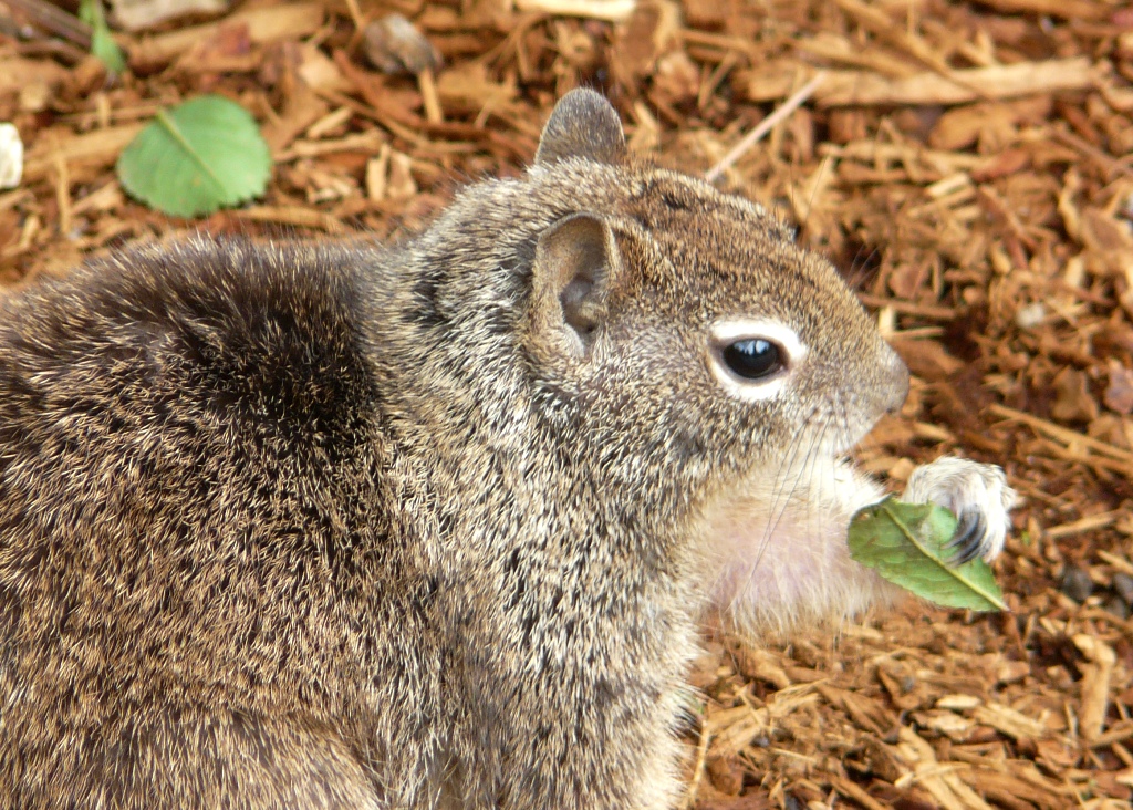 Here is the same female eating a leaf. California Ground Squirrels eat a wide variety of plant matter to build fat reserves for their winter hibernation.