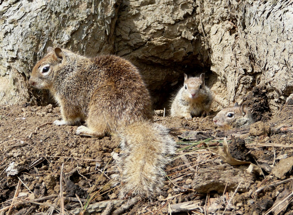 This female with her two young had a burrow at the base of a large tree at the Portland Rose Garden. Notice that when the fur is ruffed up, as on this individual, the white spots are much harder to see, making it harder to differentiate this species from one of the tree squirrels. California Grounds Squirrels can be solitary or live in loose colonies. When living in a colony, each individual has their own private burrow entrance.