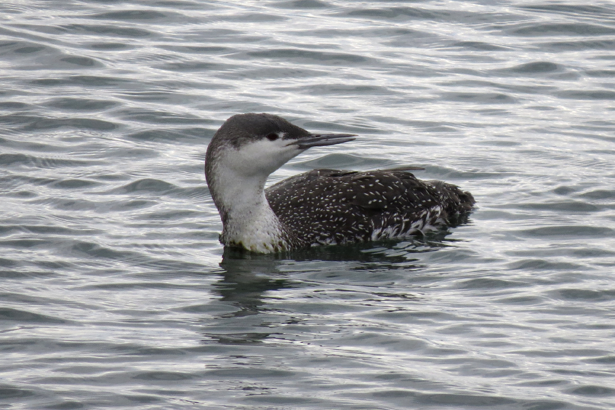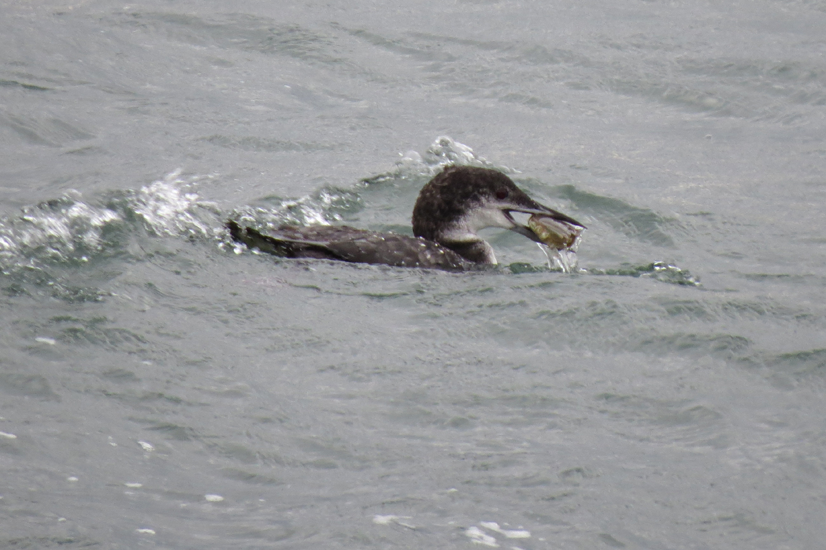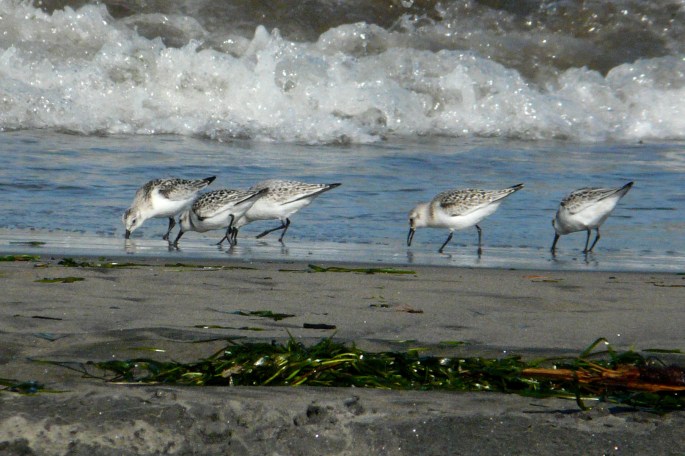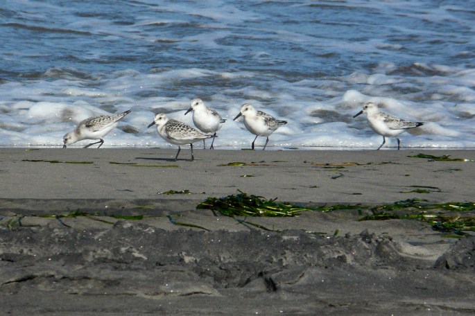 Southbound shorebird migration tends to come in waves, and we were between waves on this visit. Our consolation birds were this flock of Common Mergansers with a California Gull.