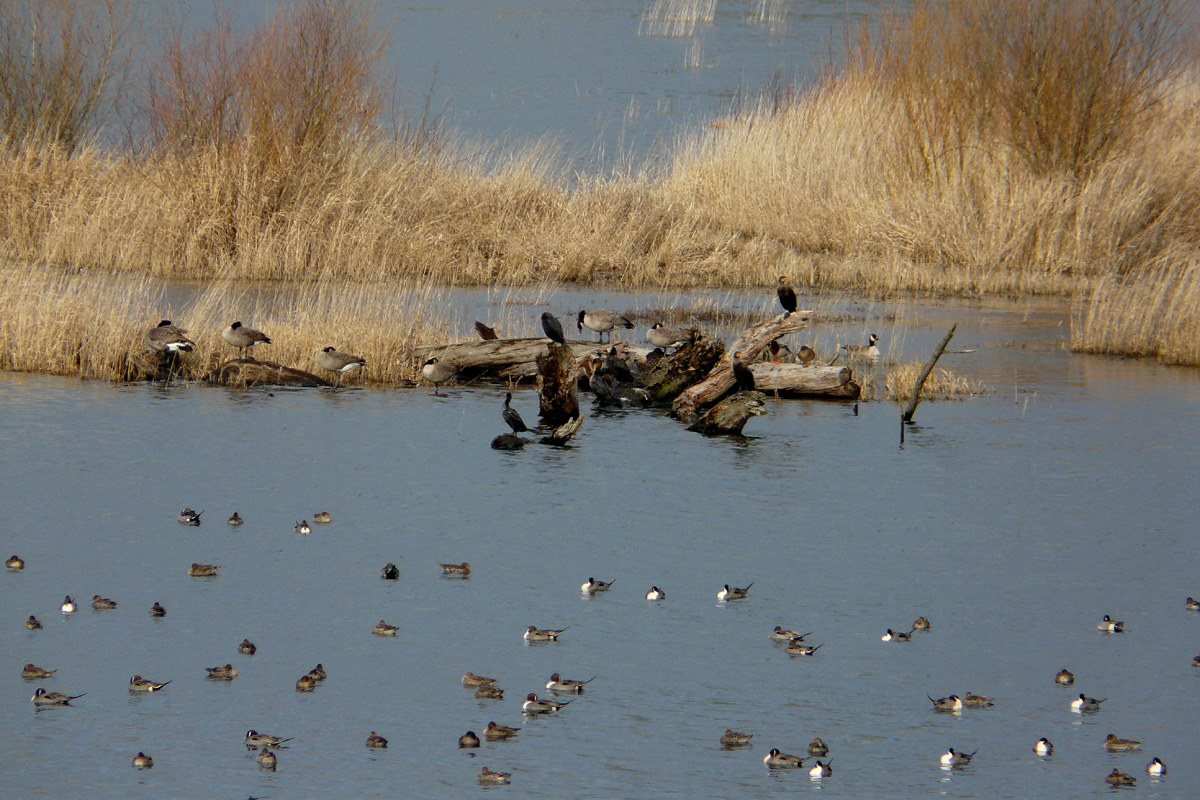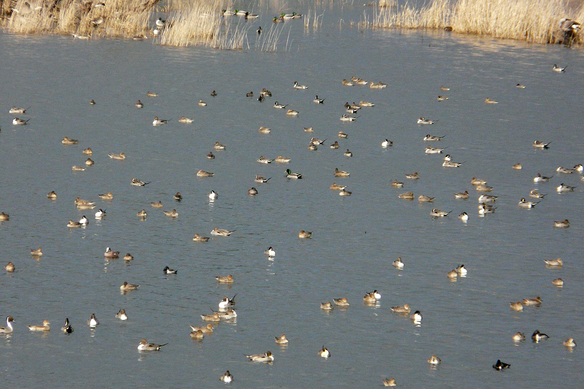 a congregation of Northern Pintails, Mallards, and Ring-necked Ducks