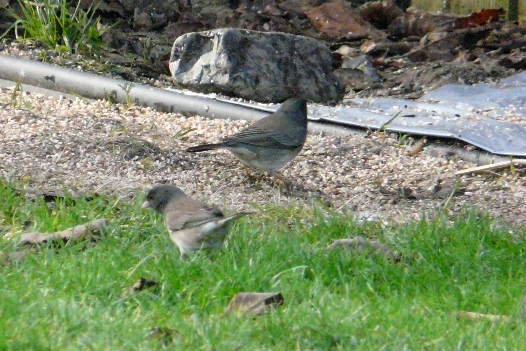 Notice that the Dark-eyed Junco on the left has some dark gray on the sides and a darker back than the typical Oregon race birds.