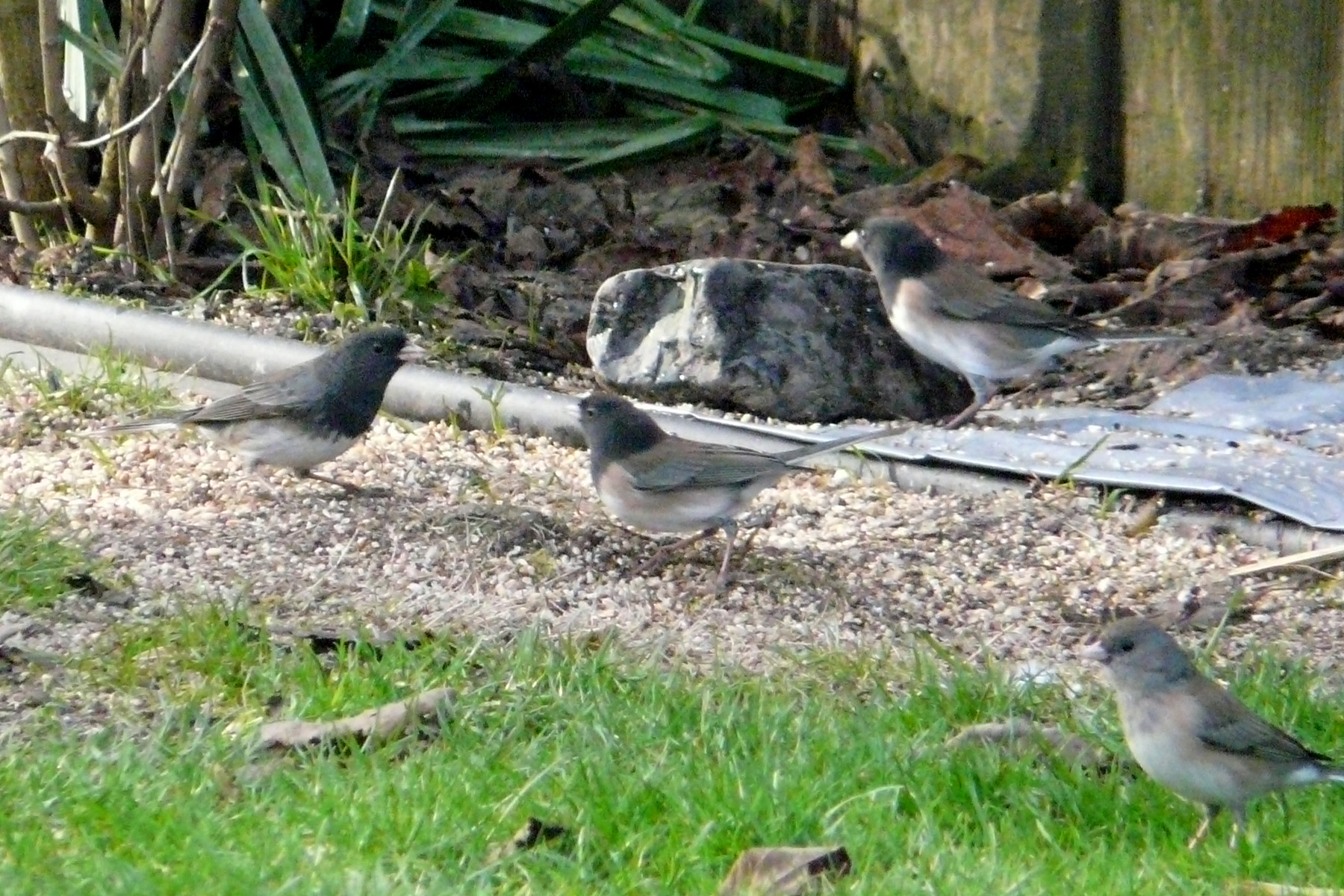 Here is the same bird from the back. The brownish cast on the bird’s back is not right for a pure Slate-colored Junco, so I think this bird is an intergrade Slate-colored/Oregon.