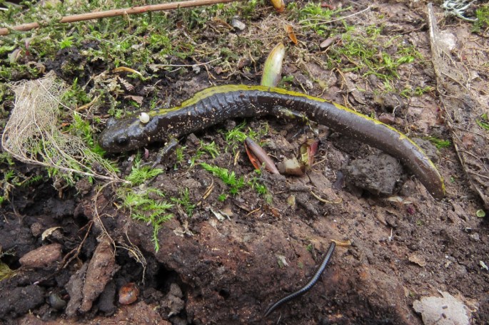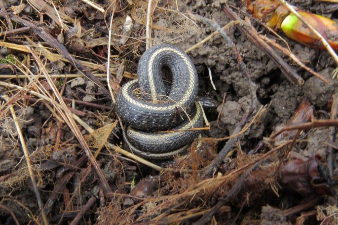 This Northwestern Garter was hiding under a piece of bark near a stump. The cloudy eyes indicate that the snake is about to shed. Snakes in this condition cannot see well, so I generally avoid handling them.