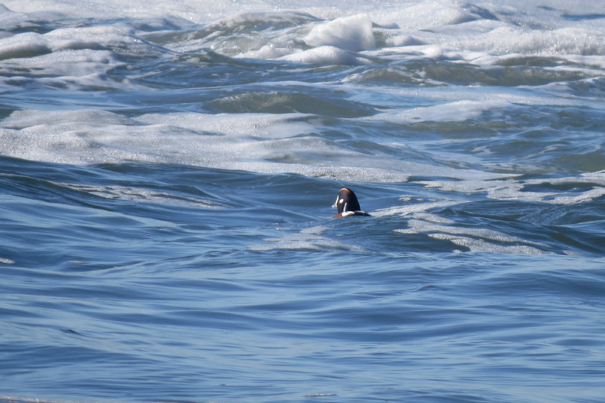 In the surf around Haystack Rock, there were lots of Surf Scoters and Black Scoters, but they kept out of camera range. This is a Harlequin Duck. No, really.