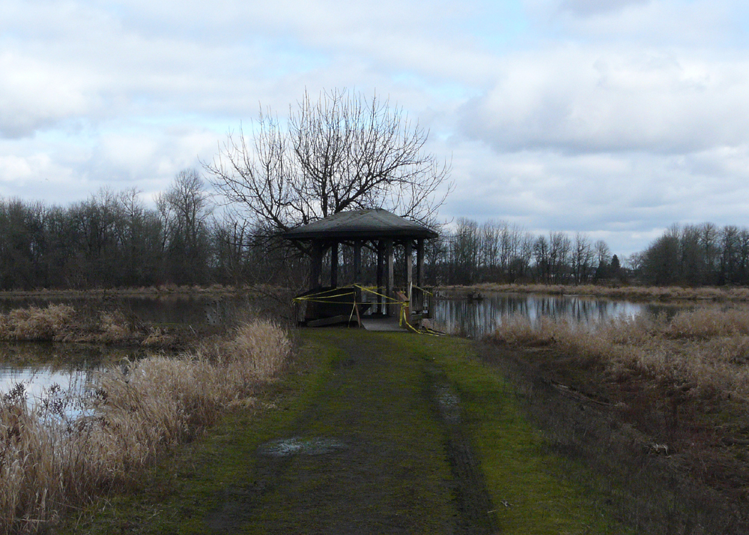 This observation platform was destroyed by arsonists. Fernhill Wetlands is not a park, but is owned by the area waste water department. As a result, there are few resources for facilities or habitat management.