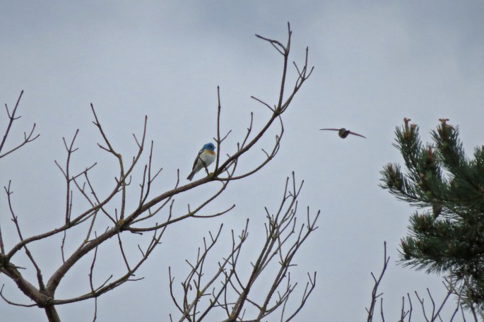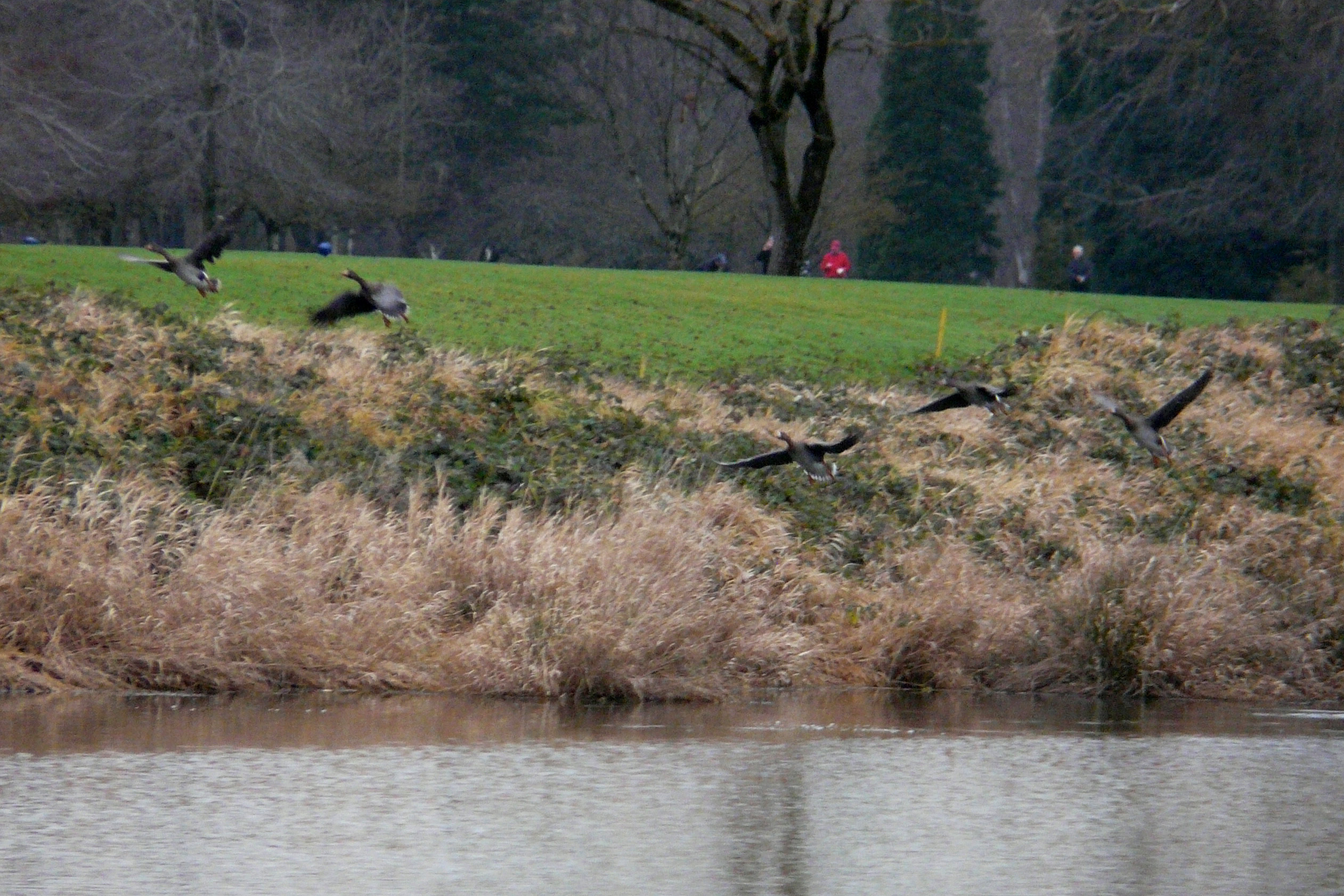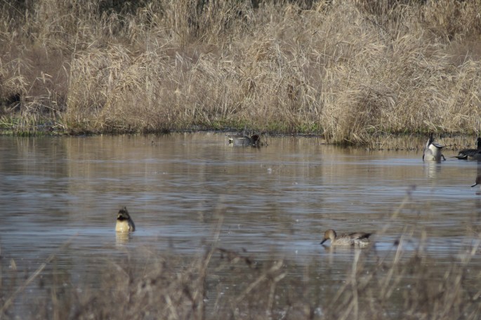 Here is a very distant Eurasian Green-winged Teal, or Common Teal, or Eurasian Teal, depending on who you talk to. In Europe, this is considered a separate species, but in the U.S., it is considered a subspecies of Green-winged Teal. I have been hoping for many years that North American authorities would recognize this form as a species (so I could add another tick to my list), but it doesn’t look like that is going to happen.