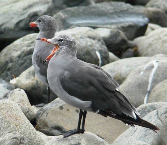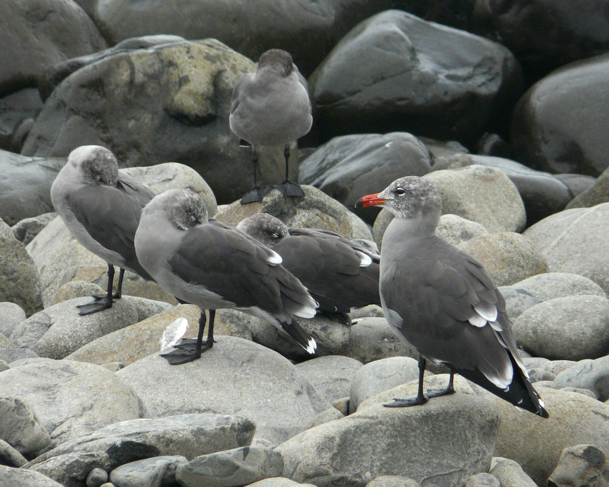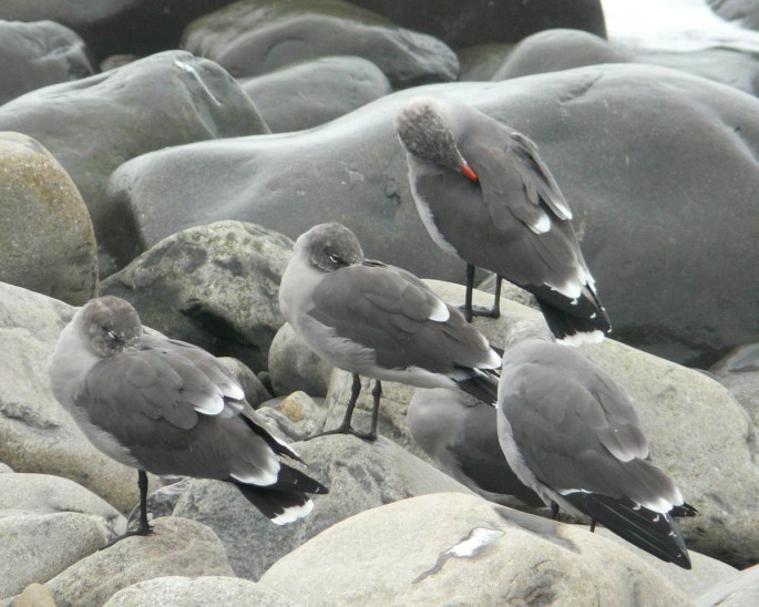 The rocky shore of The Cove in Seaside (Birding Oregon p. 121) is a favorite loafing spot for Heerman’s Gulls. The gray stones match the velvety gray of the gulls, and make the flash of brilliant red from the gulls’ bills even more stunning. Heerman’s Gulls are certainly among the most beautiful birds in North America.