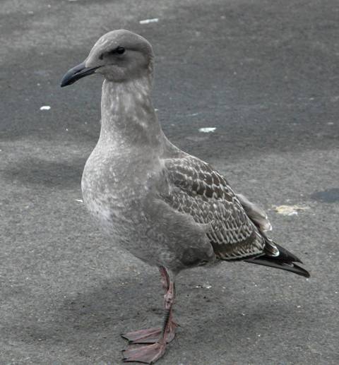 This gull is also primarily gray, but doesn’t quite have the rich color saturation of a Heerman’s. This is a first cycle Western Gull.
