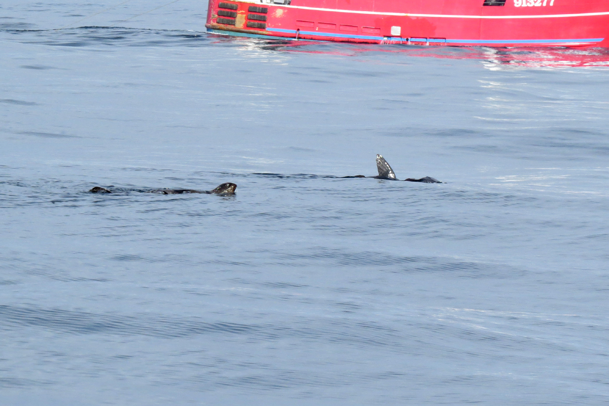 The calm waters allowed us to see many Northern Fur Seals, recognizable by their habit of sticking their large pectoral fins out of the water.
