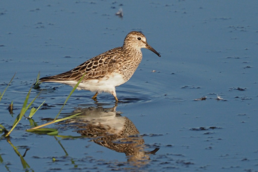 This juvenile Western Sandpiper is already molting into their first winter plumage. Some gray feathers are appearing on the wings and the rusty “suspenders” that young Westerns are known for are fading.