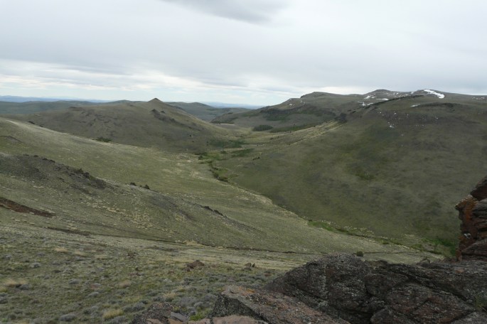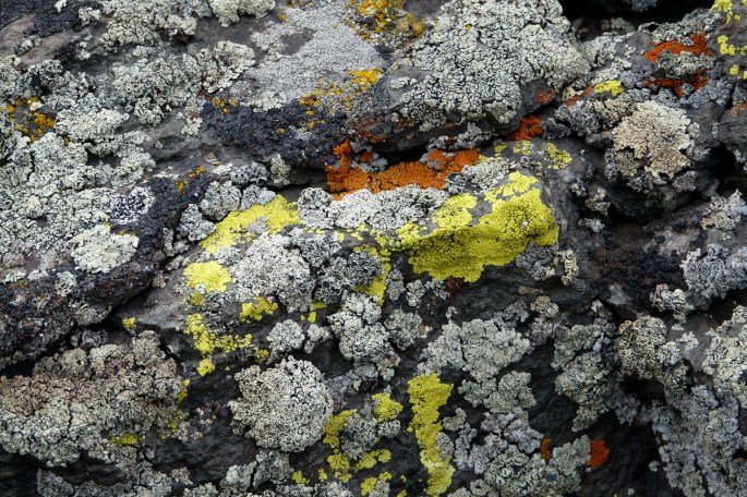 Exposure to cold and wind limits plant growth near the top of Hart Mountain, but many of the rocks host colorful lichens.