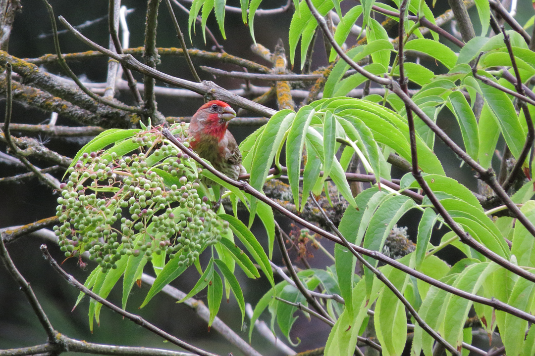 This House Finch was feeding on green Elderberries at Smith and Bybee Wetlands.