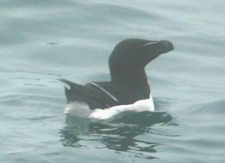 Here is a flock of Razorbills, with two Common Murres on the lower right.
