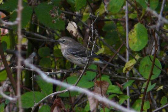 Flocks of Yellow-rumped Warblers were moving through the woods and brushy areas of Oak Island today. This individual is a female of the Myrtle race. Notice how the white throat is cleanly separated from the gray cheek, with the white starting to wrap around the ear coverts. Audubon’s race does not show this clear demarcation.