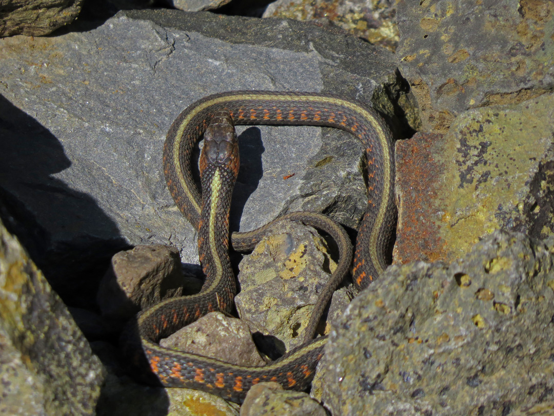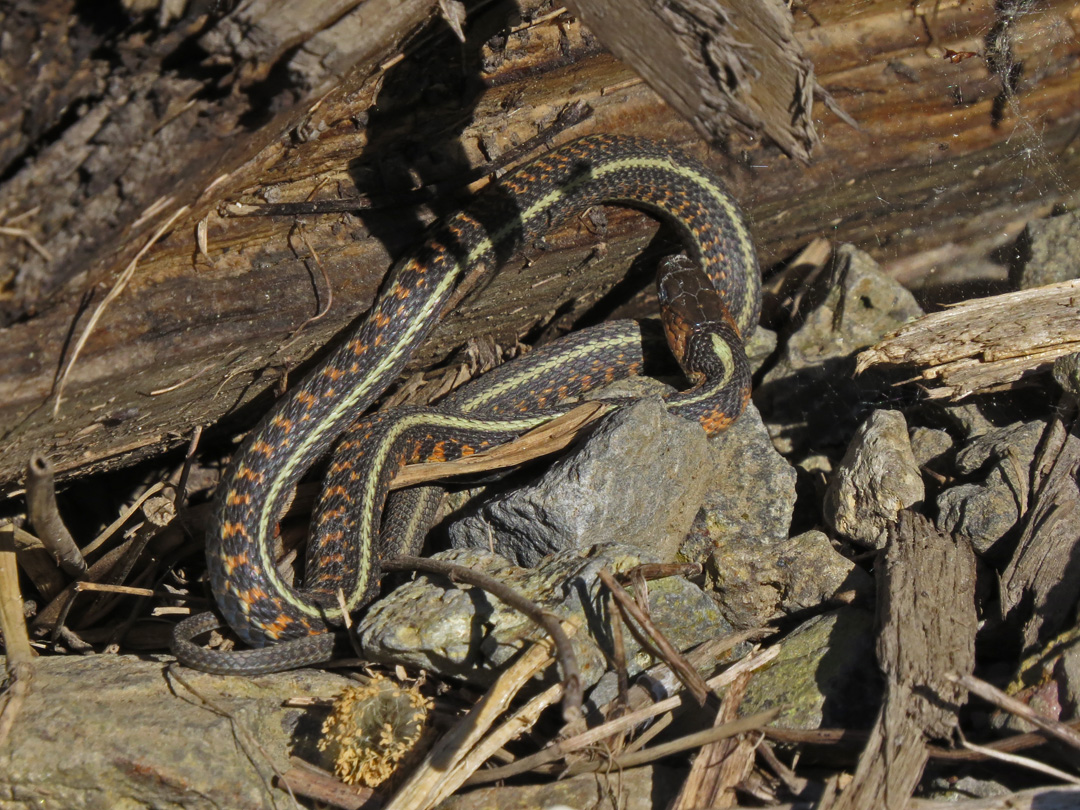 This was my first snake of the season, found at Wapato Greenway State Park on Sauvie Island. I am not sure if this is a Common Garter or a Northwestern Garter. The body pattern most closely matches the local race of Common Garter, but they typically have red heads. Our local Northwestern Garters do not show red spots on the sides, but do have small dark heads. I did not apply one test that has often worked for me; If you pick them up and they bite you, they are Common Garters. If they don’t try to bite, they are Northwestern. I don’t know if other herpers have noticed this trend, but I have found it to be true of individual snakes of known identity.