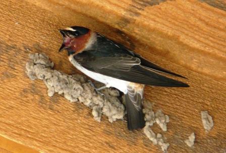 These birds would perch on a set of Mule Deer antlers mounted above the door before entering the shed to attend the nest. The fact that this bird is carrying food indicates that the eggs have hatched.