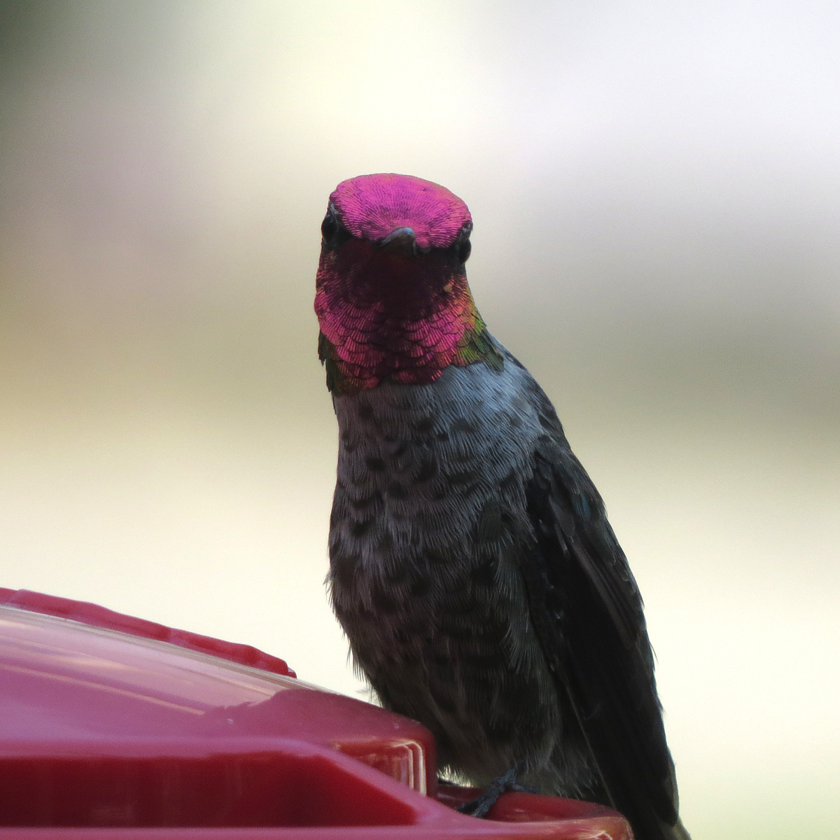 The resident Anna’s Hummingbird is not pleased with the Rufous invaders.