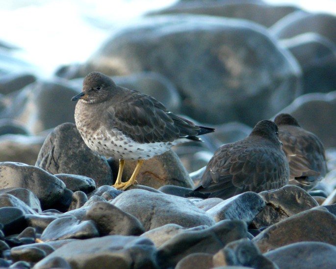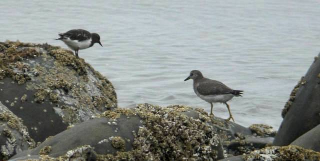 Here are two species in the “rockpiper” group of shorebirds, named for their preferred habitat. The bird on the left is a Black Turnstone. On the right is a Surfbird.