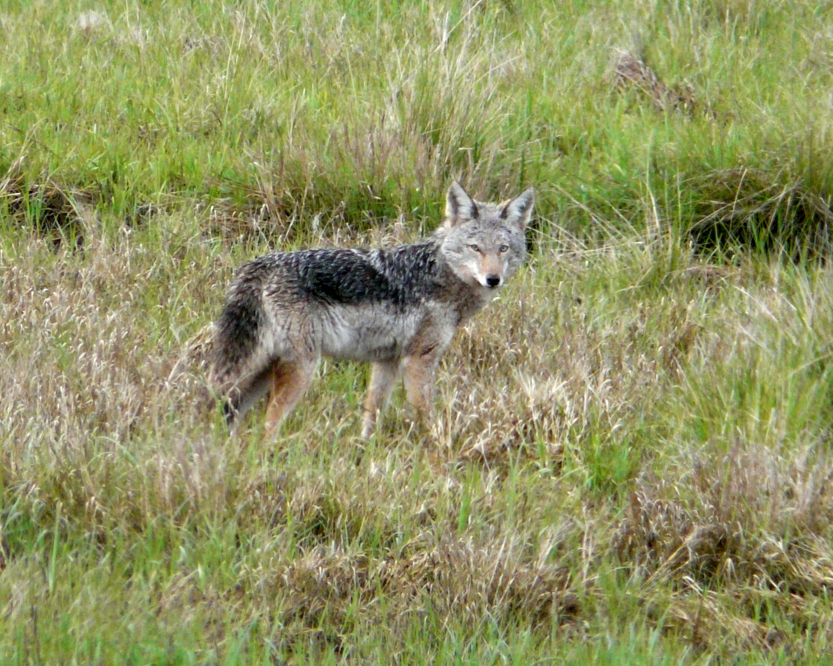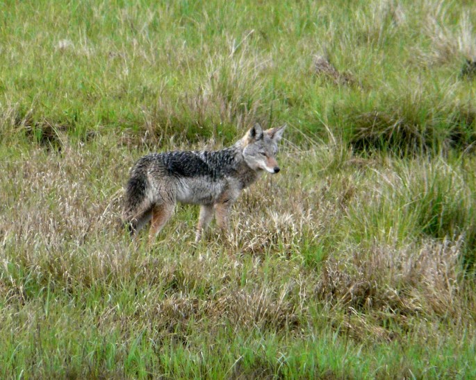 Two Coyotes were hunting in a meadow along Tillamook Bay. There is no shoulder along much of Bayocean Road, so I had to make a brief stop in the middle of the road to snap a couple of photos. I was struck by how dark these animals were, compared to Coyotes I see inland.