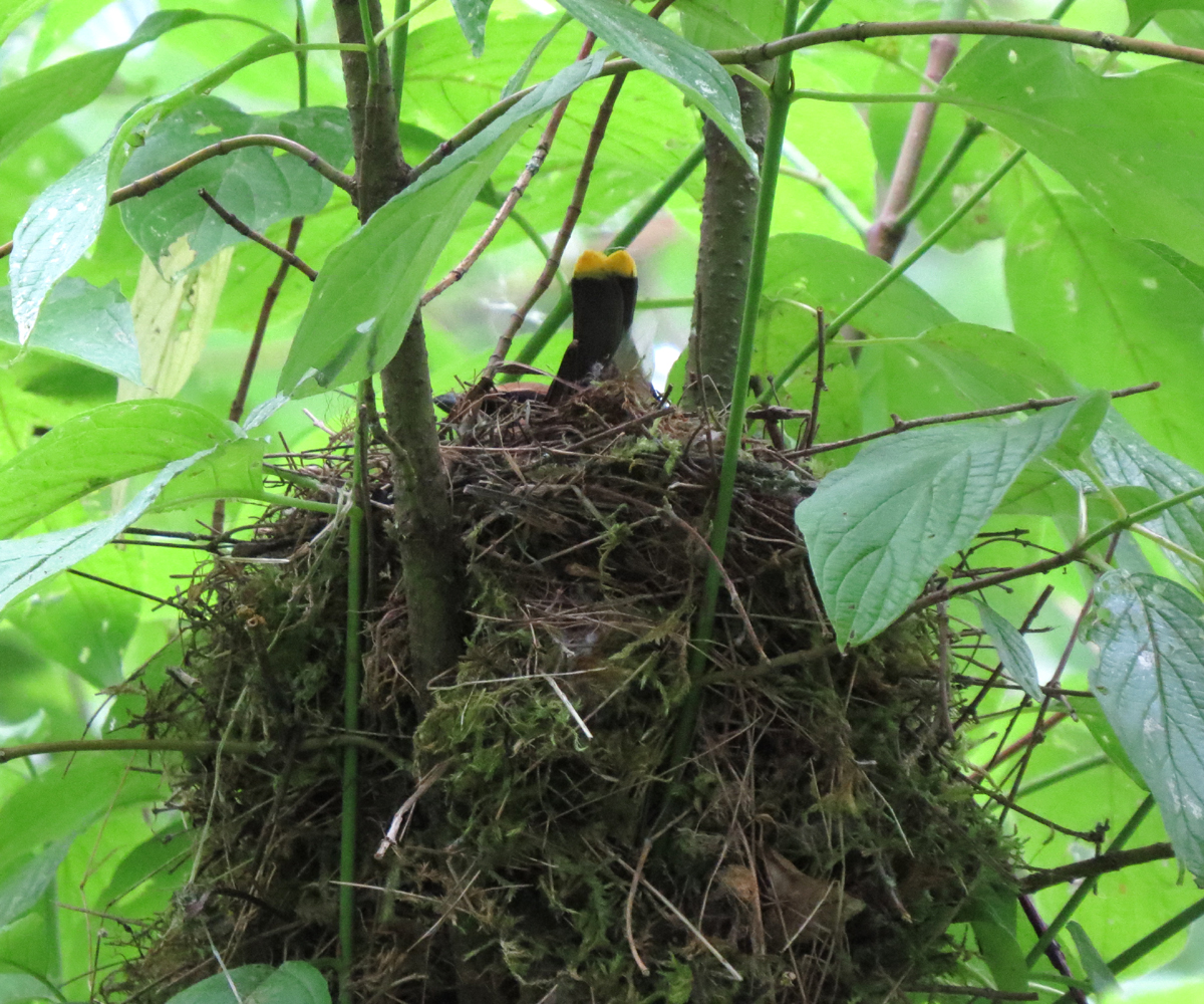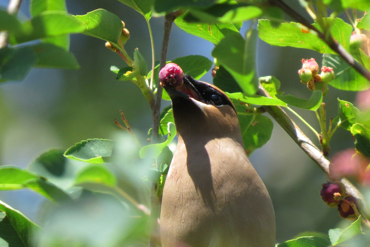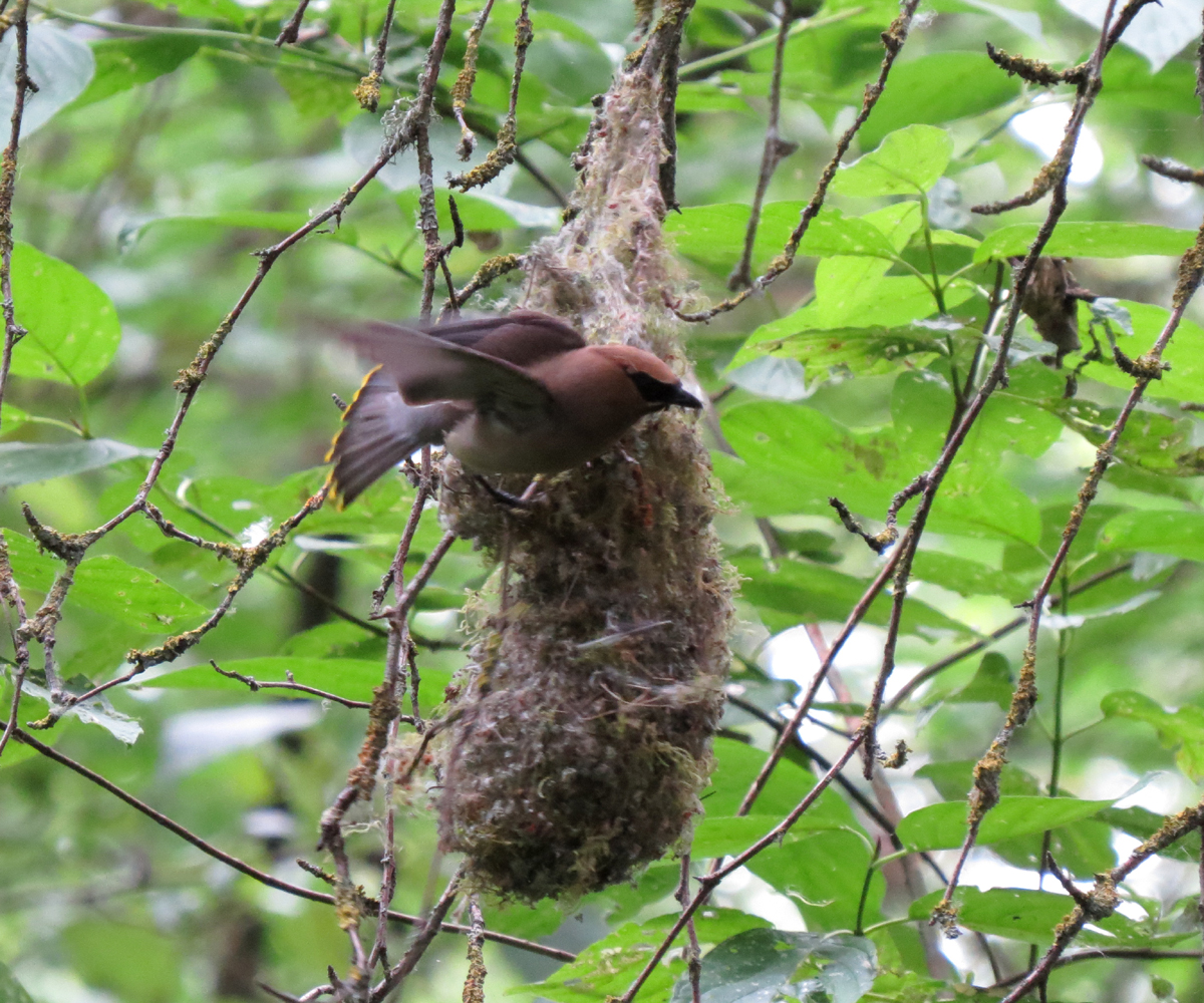 Here is the tail end of a Cedar Waxwing sitting on a nest. This seems like an awfully large nest for such a small bird.