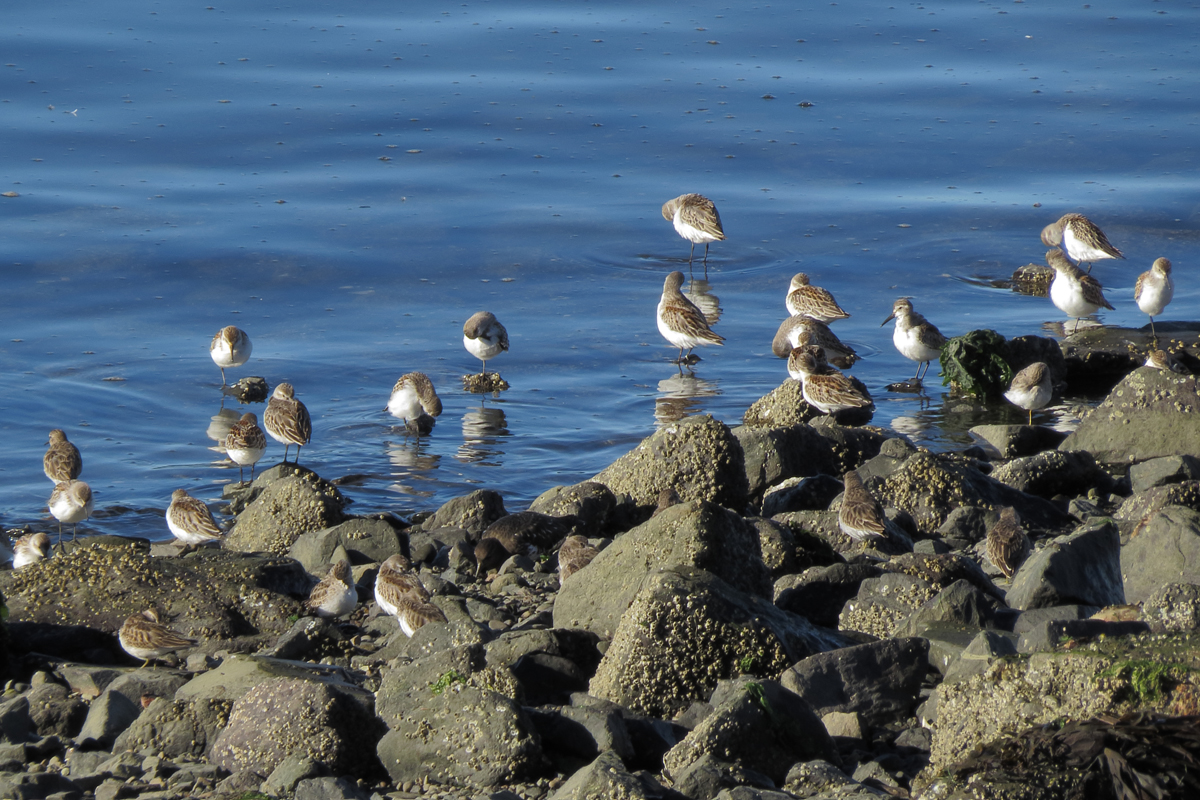 With the east winds, shorebirds were very rare on this trip. This mixed flock of Least and Western Sandpipers at the oyster plant was the only big flock of the day.